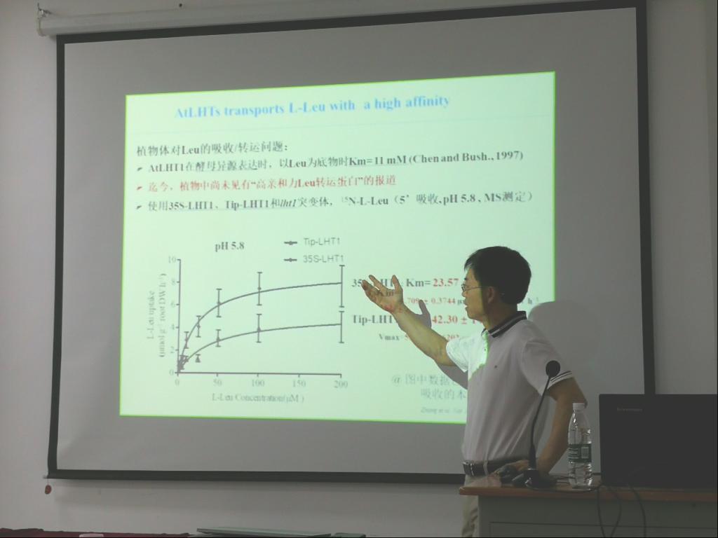 进行学术交流,并做《Plant root system growth in response to external amino acids》的精彩学术报告。刘来华教授的报告介绍了其课题组在植物根系响应外源氨基酸的机理、植物氨基酸转运蛋白方面的研究进展,重点讲解了关于拟南芥谷氨酸转运蛋白AtGLR2.5和亮氨酸和异亮氨酸转运蛋白LHT1的研究。刘来华教授生动地阐明了植物根系特异感知外源谷氨酸和亮氨酸,并通过氨基酸转运蛋白介导目的氨基酸转运的机制。刘教授的工作新颖扎实,报告清晰有趣,激起参会师生的广泛兴趣。报告后,刘来华教授与玩偶姐姐