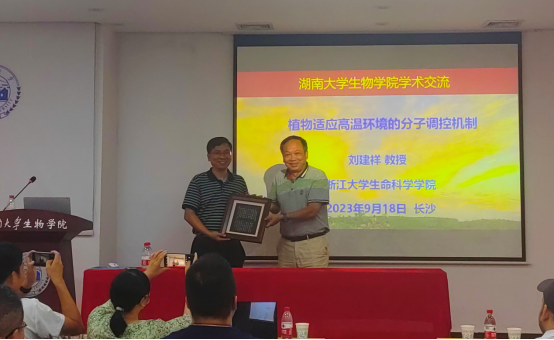 本次报告刘建祥教授以“挽救春姑娘”、“油门和刹车”等故事角度,趣味性给师生们解读了植物热形态建成的机制。首先,刘建祥教授介绍了温和高温下,BBX18招募E3泛素连接酶XBAT31泛素化降解温度传感器ELF3蛋白,解除ELF3对转录因子PIF4的抑制作用,促进植物生长发育的分子机制。然后,介绍了温和高温下RVE5通过竞争缓冲了CCA1对ELF4的抑制作用,从而促进(维持)了ELF4的表达水平,并精细调控温和高温下植物的生长。紧接着,刘建祥教授介绍了两个跨膜转录因子bzip28和bzip60参与水稻响应极端高温胁迫的机制。本次报告非常精彩,既有理论知识又有许多应用实例,生动有趣。问答阶段,刘建祥教授耐心地一一解答了师生的提问,还幽默地讲述了自己求学的经历,以及学术成果背后的励志小故事,现场反响热烈,学术氛围极佳。刘选明教授代表玩偶姐姐