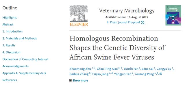 本工作的完成不仅有利于增强对于非洲猪瘟病毒进化机制的理解,而且也为该病毒的防控提供了一定的科学依据。相关结果于2019年8月10日在线发表于国际兽医学权威期刊