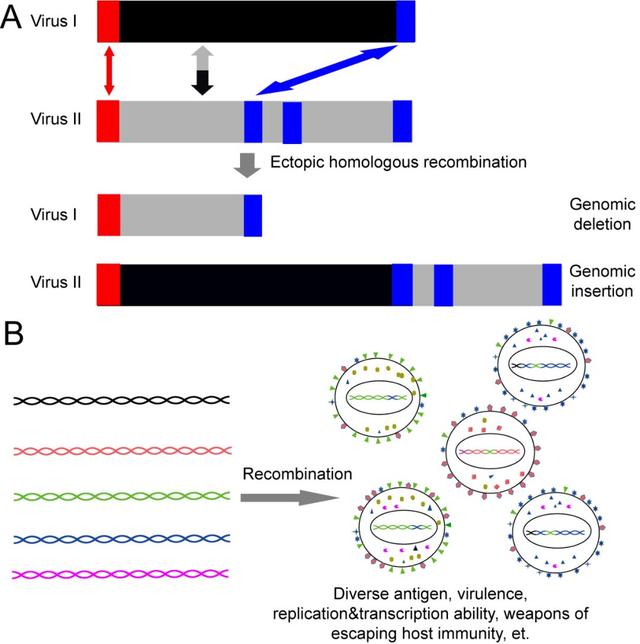 综上,非洲猪瘟病毒基因组中存在的大量重复元件有利于基因组重组的发生,重组进一步导致了病毒基因组的多样性以及病毒表型(如抗原/致病性等)的多样性,极大增加了防控该病毒的难度。