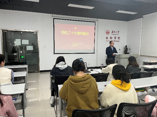 支部首先从党的二十大召开的时代背景、主要成果,二十大报告的主题,二十大报告如何系统总结新时代十年,以中国式现代化全面推进中华民族伟大复兴,全面建设社会主义现代化国家的目标任务和全面部署,坚持党的全面领导和全面从严治党,应对前进道路上的风险和挑战等七个方面,对党的二十大提出的重要思想、重要观点、重大战略、重大举措作了全面系统阐述和讲解。宣讲主题鲜明、内容丰富,既有深入浅出的理论阐释,也有联系实际的生动事例,并通过提问的方式调动大家的参与积极性,这让研究生党员对全面理解和准确把握党的二十大精神具有重要的指导意义。