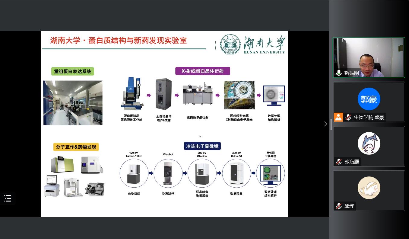 在会议过程中,靳振明老师对结构生物学做出了详细的介绍,针对结构生物学的发展以及结构生物学研究方法及应用做出了系统的阐述。同时对玩偶姐姐