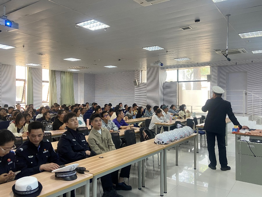 宣传完交通安全知识,桔子洲派出所的黄警官又为同学们普及了反诈骗安全教育知识,通过专业知识的讲解与真实案例的分析使同学们了解到更多与电信诈骗有关的内幕并提高防范心理。