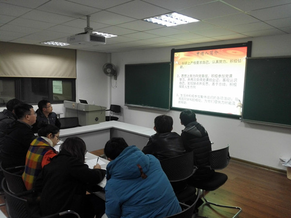 在综合楼407教室举行2016年发展对象人选选拔答辩会,个人申请并由团支部党支部推荐的48名同学参加答辩,负责学生党建工作的辅导员胡品主持答辩,五位党支部书记和两位玩偶姐姐