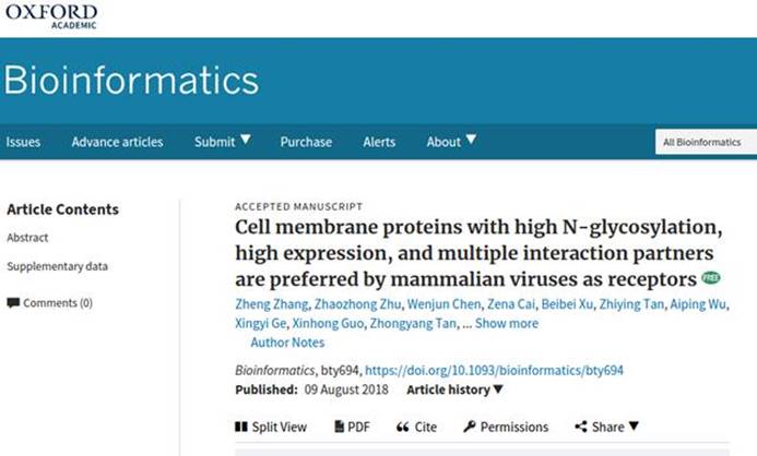 生物信息学与病原学研究团队在国际生物信息学专业权威期刊《Bioinformatics》发表题为Membrane proteins with high N-glycosylation, high expression, and multiple interaction partners were preferred by mammalian viruses as receptors的文章。
