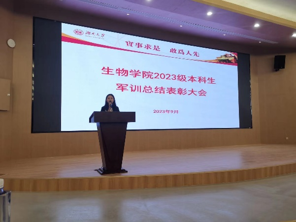 2023级本科生军训总结表彰大会于综合楼108报告厅召开。院党委副书记邹志成、辅导员于淼漪 、四营四连军训教官、新生助理及2023级全体本科生参加此次会议。会议由军训总负责樊响晴主持。