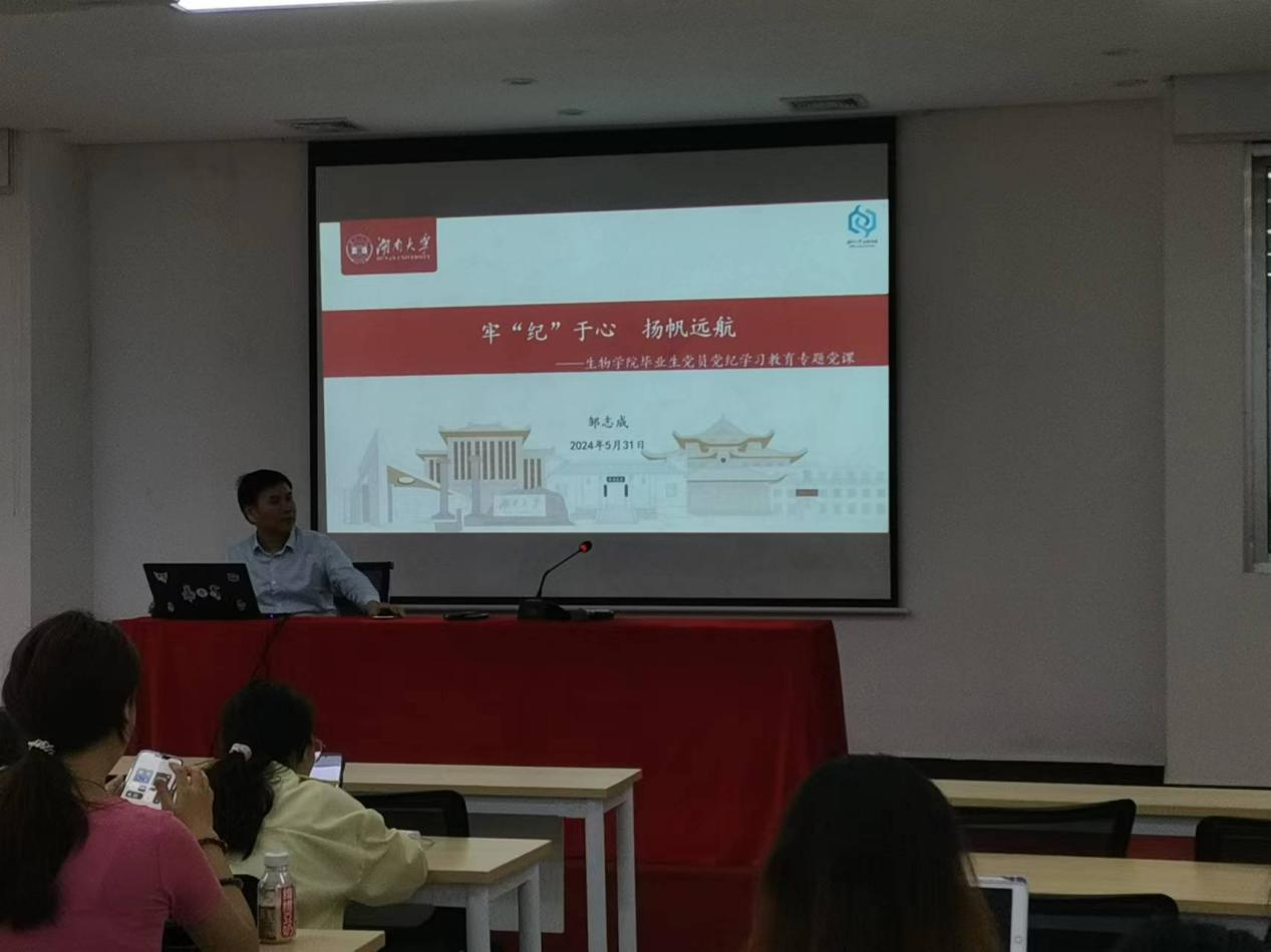 于院楼108开展“牢‘纪’于心,扬帆远航”毕业生党员党纪学习教育专题党课,本次党课由党委副书记、纪委书记邹志成宣讲,全体毕业生党员参与。