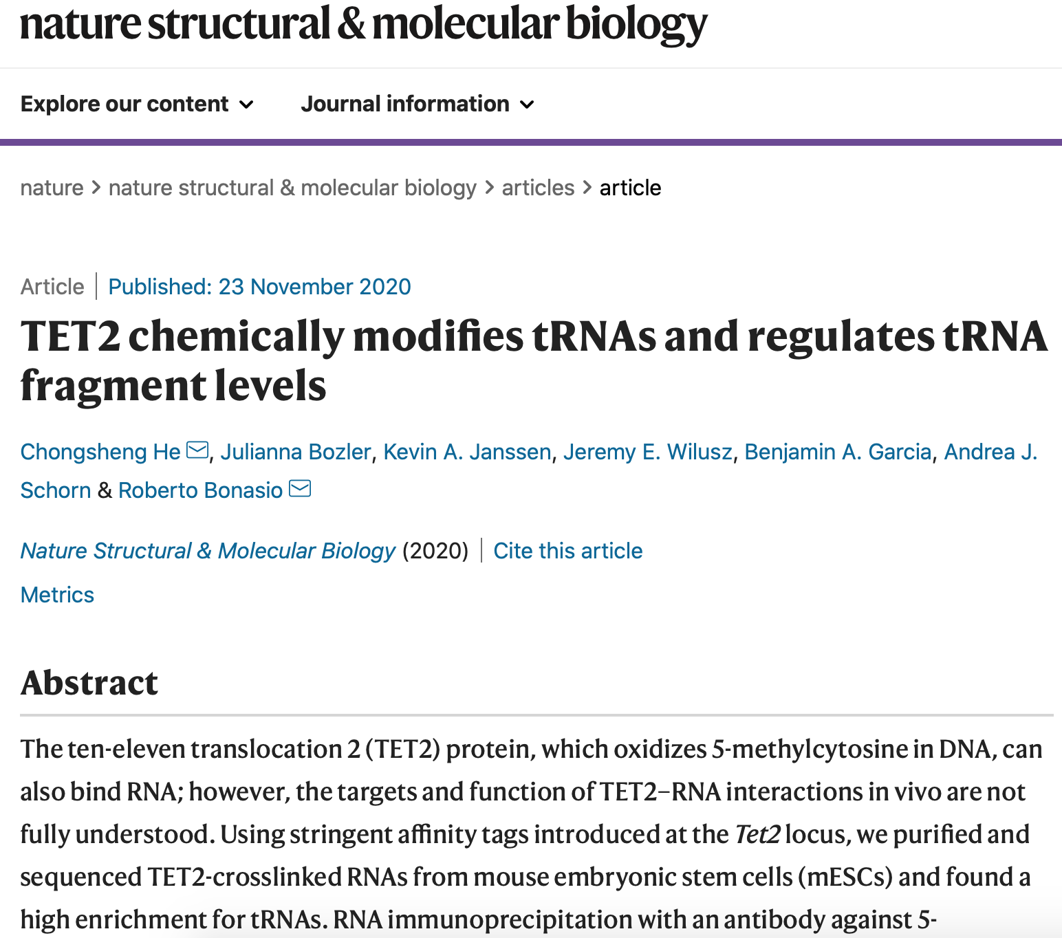 TET2是DNA甲基氧化酶,对DNA甲基化修饰进行严格的调节。TET2的这一功能跟胚胎发育、肿瘤发生等密切相关。该工作第一次在体内发现了TET2能与tRNA结合并调节hm5C修饰,同时发现了RNA上hm5C修饰影响tRNA片段产生的功能,拓展了人们对于TET2蛋白以及tRNA片段的认识。