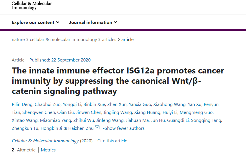 、中科院上海生物化学与细胞生物学研究所多中心合作发表的题为 “The innate immune effector ISG12a promotes cancer immunity by suppressing the canonical Wnt/β-catenin signaling pathway” 的研究性论文 [1],该论文的第一作者为玩偶姐姐