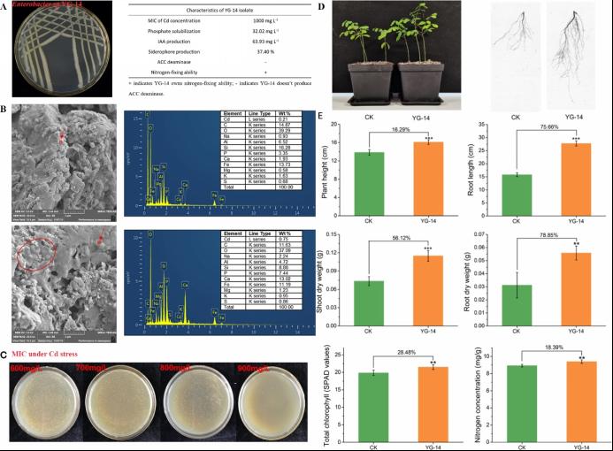 图1.A. YG-14菌落形态及植物促生理化性质;B.正常水平和镉胁迫(500mg/L)YG-14菌体形态和元素组成;C.Cd对YG-14的最小抑菌浓度(MIC)D. YG-14对刺槐幼苗生长的影响;E.YG-14接种对对刺槐生物量和光合作用的影响。