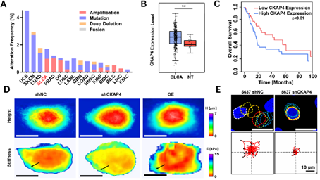 图2. CKAP4在膀胱癌中的作用。A,CKAP4在泛癌中的突变特征;B,CKAP4在膀胱癌中的表达情况;C,CKAP4表达对生存期的作用;D,CKAP4表达对细胞膜张力的作用;E,CKAP4表达对细胞运动的作用。