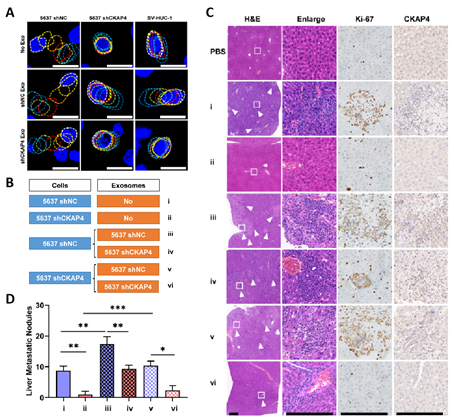 图3.外泌体CKAP4促进膀胱癌的体内转移。A,外泌体CKAP4对细胞迁移的作用;B,实验分组情况;C,外泌体CKAP4促进膀胱癌肝转移;D,外泌体CKAP4促进膀胱癌肝转移的统计分析。
