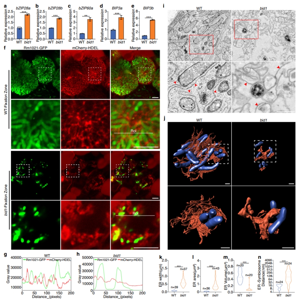 BID1基因编码信号肽蛋白酶(Signal Peptide Peptidase),功能是降解被信号肽酶切复合体切除后,残留在内质网膜上的信号肽片段。实验结果显示,BID1基因在根瘤组织中被根瘤菌侵染的细胞中特异表达。荧光共聚焦显微观察表明,BID1蛋白特异定位在根瘤细胞的内质网膜上。缺失了BID1基因后,根瘤细胞的内质网胁迫相关基因被诱导。有意思的是,bid1突变体根瘤细胞中,内质网的形态也发生了剧烈变化。荧光共聚焦显微观察和透射电镜连续切片和3D模型构建表明,野生型根瘤细胞中,内质网紧密围绕在共生体周围。而bid1突变体中,内质网不再是规则的网状结构,也不能围绕在共生体周围。这些结果说明,BID1是内质网形态维持的重要调控元件。在此基础上,我们发现在bid1根瘤细胞中,多个关键共生体调控蛋白如NCR001,NCR166,CAML1等不能够正确分泌到共生体上。