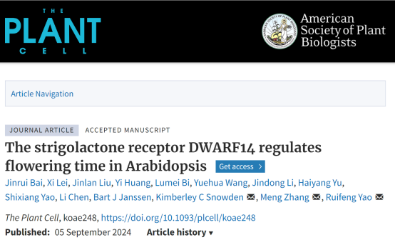 、岳麓山实验室姚瑞枫团队在《植物细胞》(Plant Cell)期刊上发表了题为《The strigolactone receptor DWARF14 regulates flowering time in Arabidopsis》的研究论文,揭示了植物激素独脚金内酯(strigolactone, SL)受体DWARF14在拟南芥开花时间调控中的关键作用和分子机制。