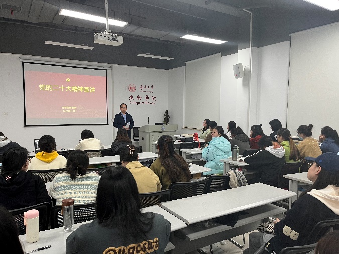 支部首先从党的二十大召开的时代背景、主要成果,二十大报告的主题,二十大报告如何系统总结新时代十年,以中国式现代化全面推进中华民族伟大复兴,全面建设社会主义现代化国家的目标任务和全面部署,坚持党的全面领导和全面从严治党,应对前进道路上的风险和挑战等七个方面,对党的二十大提出的重要思想、重要观点、重大战略、重大举措作了全面系统阐述和讲解。宣讲主题鲜明、内容丰富,既有深入浅出的理论阐释,也有联系实际的生动事例,并通过提问的方式调动大家的参与积极性,这让研究生党员对全面理解和准确把握党的二十大精神具有重要的指导意义。