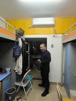 老师们来到学生宿舍,强调了人走电断、规范使用电器、电动车出行必须戴帽等宿舍用电安全和电动车出行安全问题,亲切询问了同学们的科研生活、宿舍生活是否顺利等等,同学们也积极地表达了内心想法。
