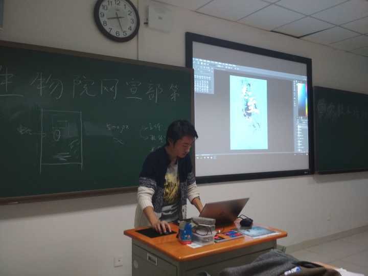 基本工作的分配与处理结束之后,第四次技术培训如期举行。此次培训的主题是PS软件的使用和宣传海报的制作。谭丞超采用了在制作过程中实时讲解的方式,带领干事们学习如何构思一张海报、如何寻找制作海报素材以及如何利用PS软件对素材进行加工制作。这一讲解方式激发了干事的积极性,在共同制作海报的过程中,干事们对谭丞超提出的问题认真思考,发表建议,共同探索制作海报的技巧。生动地讲解方式也使同学们对海报制作的了解更加印象深刻。