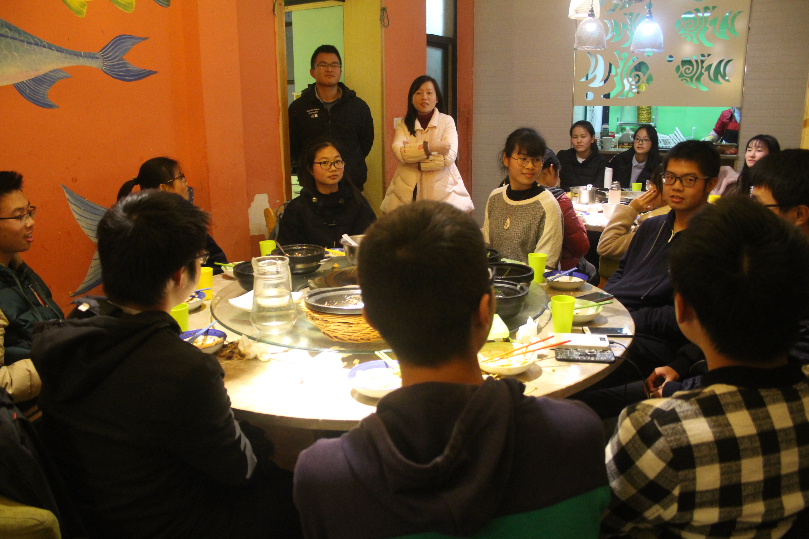 班会伊始,胡老师询问了同学们的近况,有同学提出由于天气愈加寒冷,同学们大多数存在懒床症,甚至部分同学放弃早餐时间而选择睡觉。对此,胡老师希望同宿舍室友相互帮助,起的早的同学要记得叫醒室友,并且要互相关心,营造一个有爱的宿舍和班级。部分同学也提出了专业上的问题,胡老师都一一为同学们答疑解惑,并告诉同学们要勤学好问,问问题也是一个提升自己的过程。在师生的交谈中,这次特殊班会的气氛逐渐变得活跃温馨。在热气腾腾的饭菜上来后,同学们更是热情高涨,举杯感谢老师。不一样的班会,同学们有了与老师更近的接触,师生聊起各种趣事,笑声环绕在整个房间里面,而师生情也悄然加深。