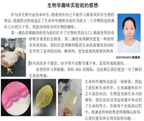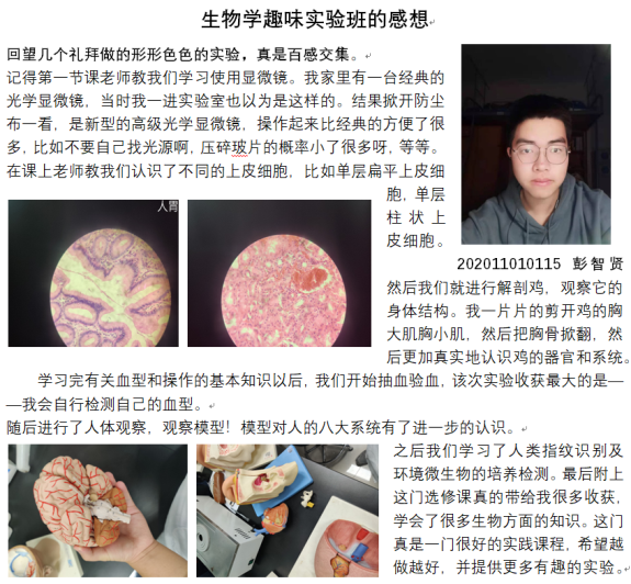 的本科生参加学习。课程共32个学时,内容包括显微镜的使用、家鸡的外形和内部解剖、ABO血型鉴定及血涂片的制作与血细胞显微观察、人体九大系统自我认知、叶片的构造及“叶脉书签”的制作、人类指纹的识别,质粒DNA的提取、环境微生物的培养检测、实验测试等教学内容。