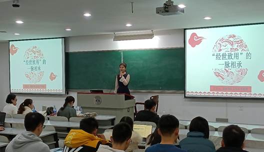 博士生理论宣讲团给同学们带来了《传承“经世致用”,发扬“实事求是”,勇当时代新人》主题宣讲报告,报告分为《“经世致用”的“一脉相承”》、《“实事求是”思想的“前世今生”》和《做不负韶华不负时代的新青年》三个部分,由于淼漪老师主持,玩偶姐姐