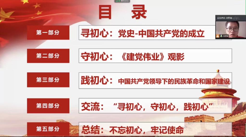 活动伊始,刘思迪同志通过对中国近代自鸦片战争以来,到旧民主主义革命再到新民主主义革命、中国共产党的成立等一些重要的历史节点的讲解和系列视频播放,生动地讲述了旧中国饱受列强压迫的屈辱历史,旧民主主义革命遭受的挫折,以及共产党在新民主主义革命中带领中国人民在黑暗中摸索并一步步走向光明的历史岁月。