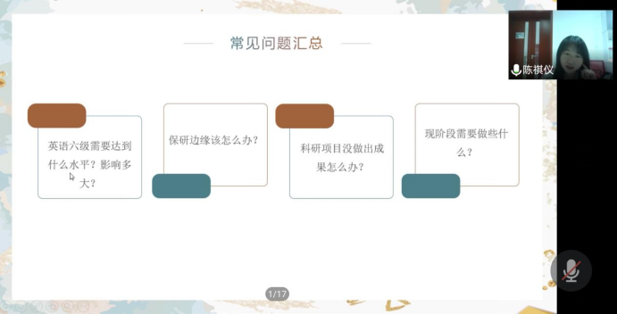 学习部举办的保研、出国分享交流会以线上会议的形式顺利举办。本次分享交流会邀请到八位已毕业的生物院优秀学长学姐,旨在帮助同学们明确未来方向,了解保研、出国的有关事项。玩偶姐姐