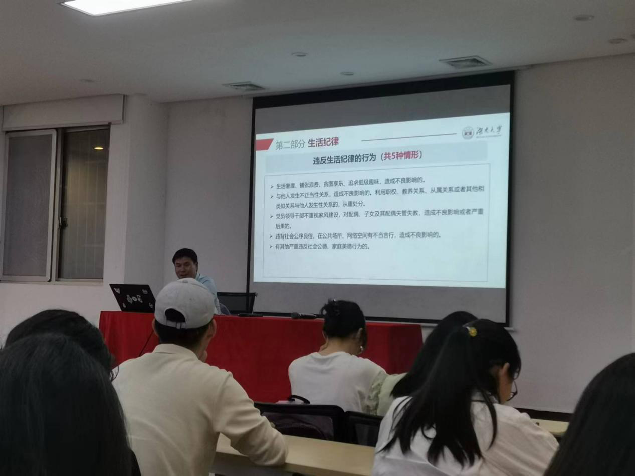 于院楼108开展“牢‘纪’于心,扬帆远航”毕业生党员党纪学习教育专题党课,本次党课由党委副书记、纪委书记邹志成宣讲,全体毕业生党员参与。