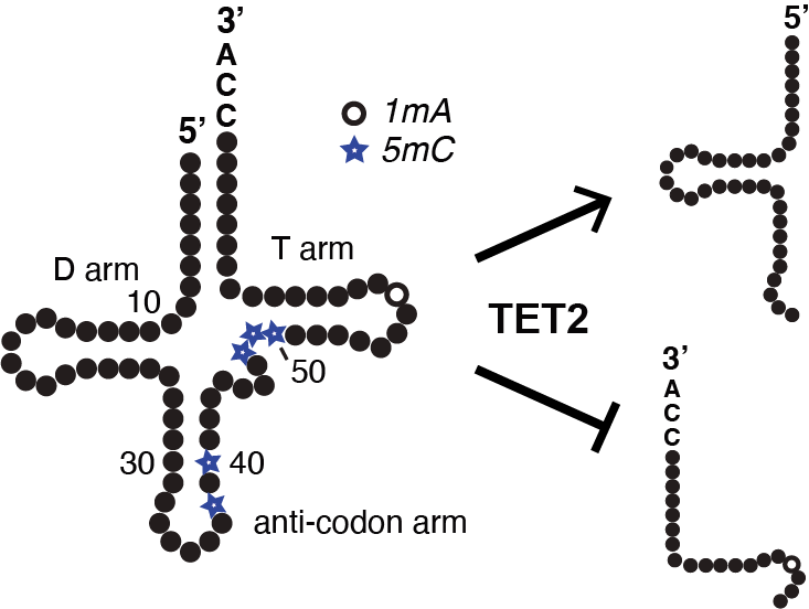 TET2是DNA甲基氧化酶,对DNA甲基化修饰进行严格的调节。TET2的这一功能跟胚胎发育、肿瘤发生等密切相关。该工作第一次在体内发现了TET2能与tRNA结合并调节hm5C修饰,同时发现了RNA上hm5C修饰影响tRNA片段产生的功能,拓展了人们对于TET2蛋白以及tRNA片段的认识。