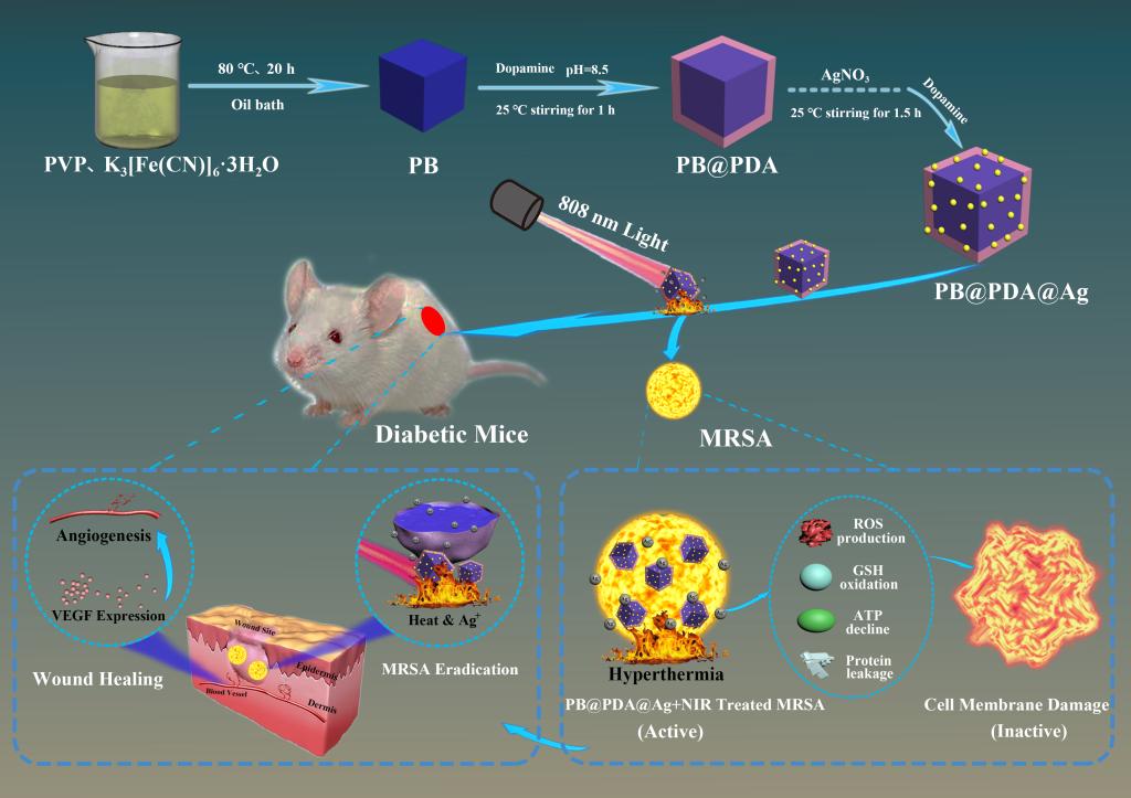 刘斌副教授课题组针对纳米银材料的团聚和抗菌效能问题,创造性的将银纳米粒子镶嵌在具有良好光热性能的普鲁士蓝纳米复合物表面,构建了一种双模式纳米抗菌复合物,结合近红外光激光照射技术,有效地促进了糖尿病小鼠多药耐药菌感染伤口的快速愈合。体外研究显示:这种联合抗菌策略通过破坏细胞完整性、产生ROS、降低ATP、氧化GSH等途径发挥抗多药耐药菌MRSA作用;体内实验表明:该策略通过减轻局部炎症反应和诱导创面血管内皮生长因子表达来促进MRSA感染的糖尿病创面愈合。研究结果以论文形式发表在生物材料Top期刊Biomaterials(10.1016/j.biomaterials.2020.119936),并已同步申请专利(CN201911347212.6),为后续产品研发奠定了坚实的基础。论文第一单位为玩偶姐姐