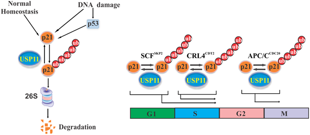 细胞增殖是细胞生命活动的重要特征之一,它的功能依赖于细胞周期的有序运行。p21是细胞周期蛋白依赖性激酶抑制子家族中的重要成员,在细胞周期调控中占据核心地位。它能通过结合并抑制细胞周期所有时相中的细胞周期素依赖激酶(Cyclin-dependent kinases CDKs)复合物活性,介导细胞周期停滞。尽管p21的调控已经被研究了二十多年,但是在细胞中p21蛋白稳定性调控并不十分清楚。这篇文章的重要学术贡献就是找到了直接稳定并调控p21的分子----USP11。