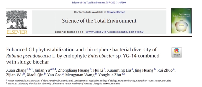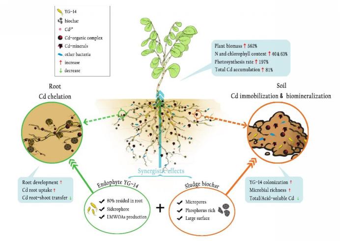 的最新合作研究成果“Enhanced Cd phytostabilization and rhizosphere bacterial diversity ofRobinia pseudoacaciaL. by endophyteEnterobactersp. YG-14 combined with sludge biochar”。研究构建了一种新型的植物内生菌-污泥基生物炭-木本植物刺槐联合修复技术,用于土壤重金属镉污染的植物固定化,土壤镉浓度和有效态可降低61.75%和69.01%,并表现出显著的植物促生效果,土壤改良和微生态改善明显,具有广阔的应用前景。