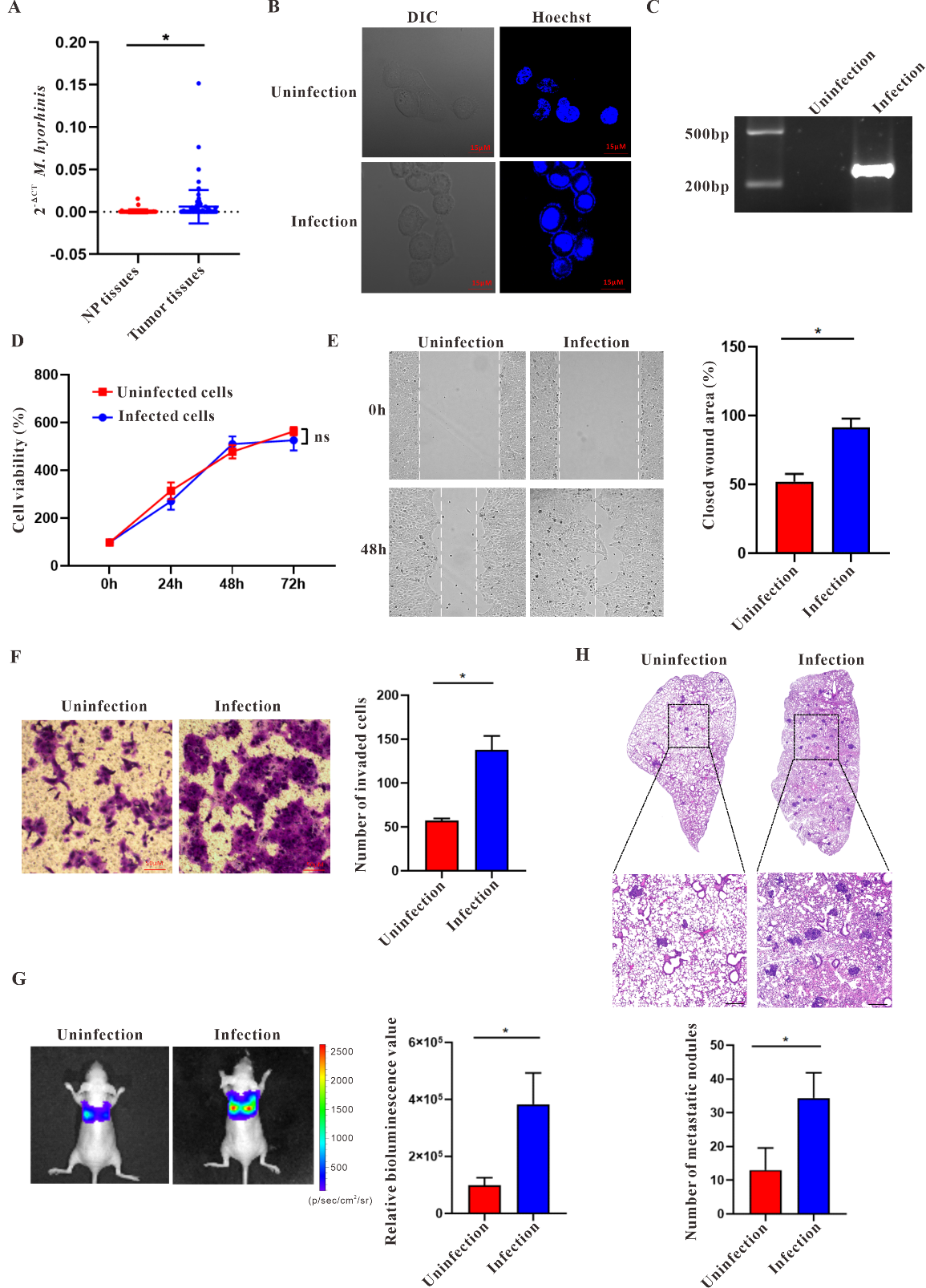 微生物感染是人类肿瘤发生和发展的危险因素之一[1]。支原体是一种无细胞壁的最小原核生物,可寄生在人体中,引起长期感染和炎症。先前的研究表明,支原体感染存在于多种人类肿瘤中[2]。其中,猪鼻支原体(Mycoplasma hyorhinis)在肿瘤组织中最常见,可诱导前列腺细胞恶性转化[3],促进胃癌、肝癌侵袭转移[4]、诱导肿瘤干性[5],导致抗肿瘤药物多药耐药[6]。已有报道明确食管癌中存在猪鼻支原体感染[2],但是其在食管癌中的功能作用尚不清楚。研究团队首先通过PCR证实食管癌组织中存在猪鼻支原体的感染。利用构建的猪鼻支原体感染的细胞模型,证明猪鼻支原体感染可在体外增强食管鳞状细胞癌细胞的迁移和侵袭能力,促进食管鳞状细胞癌细胞在小鼠体内的肺转移(图1)。