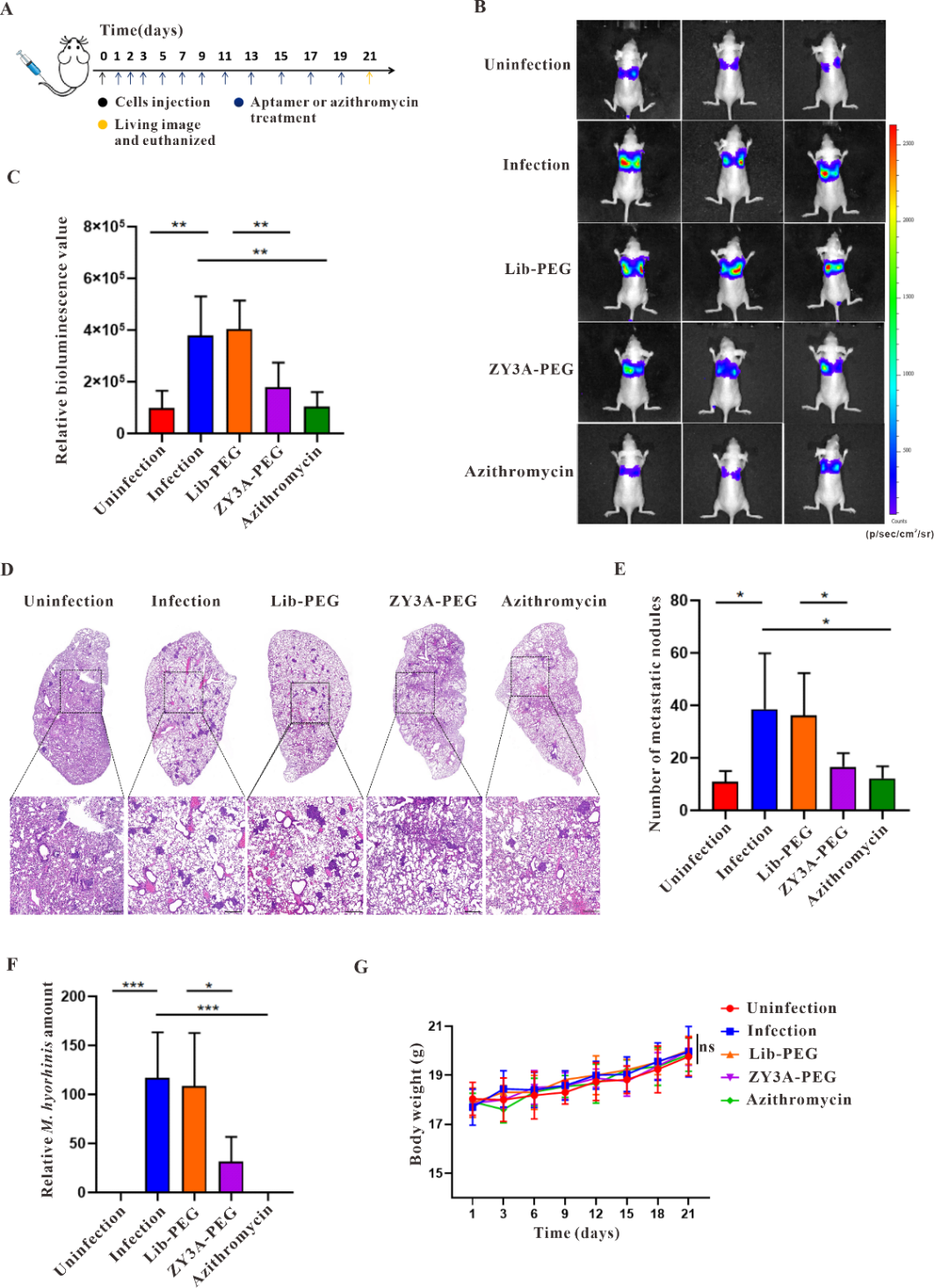 进一步研究发现该核酸适体通过与猪鼻支原体特异性蛋白p37结合,利用其空间结构的位阻效应,干扰p37蛋白与食管鳞状细胞癌细胞表面的TLR4蛋白相互作用,从而中和猪鼻支原体对食管鳞状细胞癌细胞的感染,抑制猪鼻支原体感染诱导的食管鳞状细胞癌细胞的体外迁移和侵袭以及体内的转移(图3)。这是首次使用核酸适体中和支原体感染的报告。更重要的是,该工作为利用核酸适体有效控制支原体感染性疾病打开了大门。