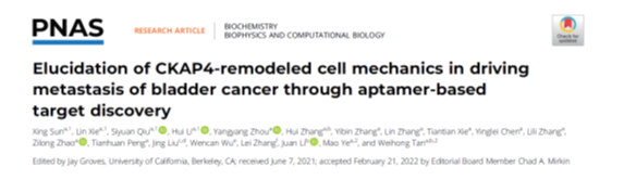院刊》(PNAS)杂志发表题为“Elucidation of CKAP4-remodeled cell mechanics in driving metastasis of bladder cancer through aptamer-based target discovery”的文章。该研究基于课题组在核酸适体研究领域的优势,利用特异性靶向膀胱癌细胞的核酸适体spl3c作为分子工具,发现在膀胱癌细胞中特异性高表达蛋白-CKAP4,明确其作为细胞膜张力调控关键因子,能重塑细胞膜中心-边缘的张力梯度,促进膀胱癌细胞的迁移。同时,还能“搭乘”外泌体实现细胞间的力学信号传递,从而加剧膀胱癌在体内的转移。