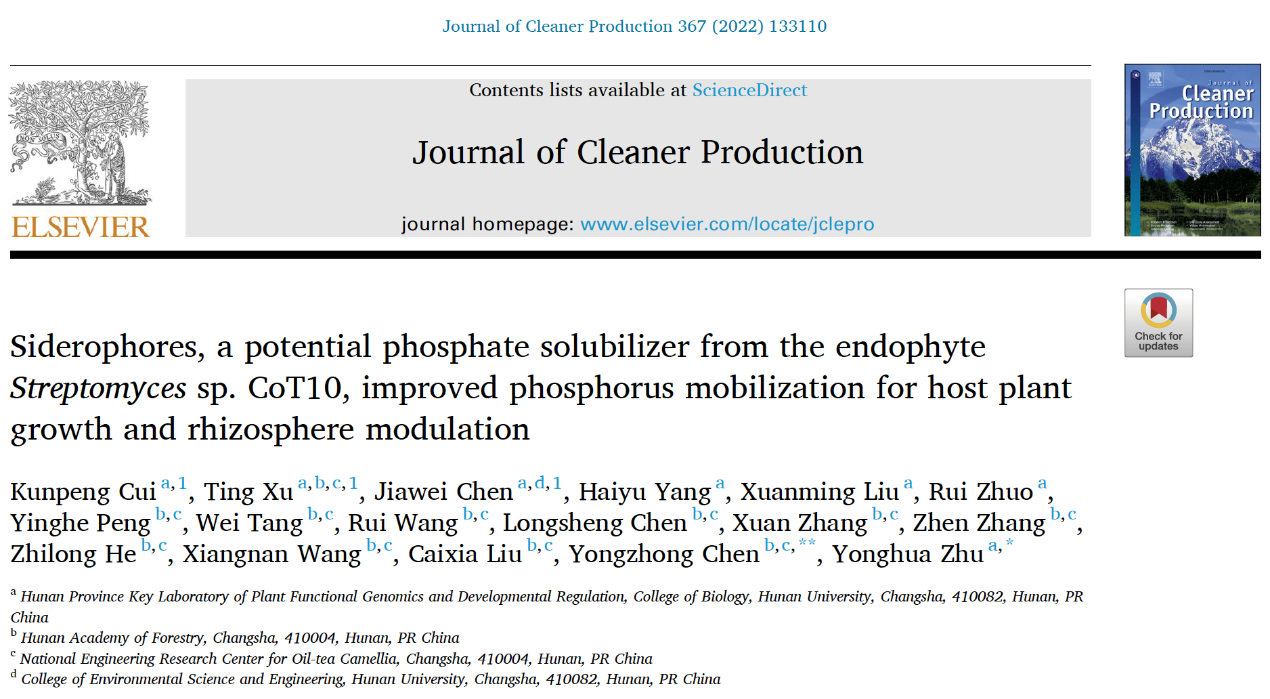 陈永忠研究员团队合作在中科院一区TOP期刊Journal of Cleaner Production(IF: 11.072)发表题为“Siderophores, a potential phosphate solubilizer from the endophyteStreptomycessp. CoT10, improved phosphorus mobilization for host plant growth and rhizosphere modulation”的研究论文。该研究首次证实了内生链霉菌CoT10通过产生铁载体来直接介导铁结合态难溶磷的活化效应,揭示了内生菌促进宿主植物生长和磷素高效利用的新的作用机制。此研究成果为调控富铁土壤中磷素的动员与活化提供新的思路,丰富植物磷养分吸收利用调控机制的科学理论,为推动内生放线菌在植物营养领域的广泛应用、开发新型微生物肥料奠定理论基础。