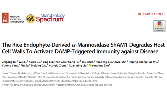 朱咏华教授团队在中科院一区TOP期刊Microbiology Spectrum (IF: 9.043)发表题为“The Rice Endophyte-Derived α-Mannosidase ShAM1 Degrades HostCell Walls To Activate DAMP-Triggered Immunity against Disease”的研究论文。该研究首次证实了内生菌来源的α-甘露糖苷酶可通过降解宿主水稻细胞壁释放低聚糖作为DAMPs来激活宿主的免疫反应,从而增强宿主水稻抵抗稻瘟病的能力。