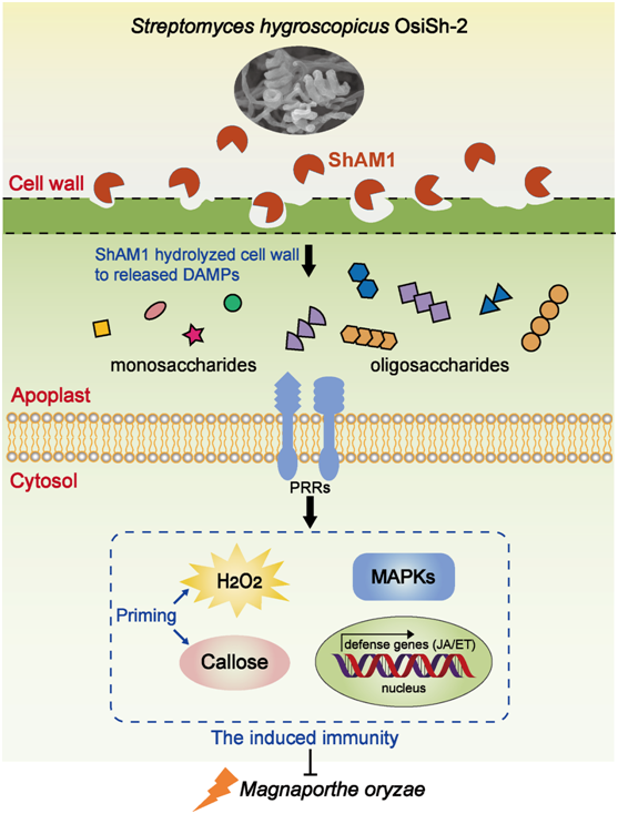 该研究针对前期筛选出的一株能显著提高水稻抗病能力的水稻内生放线菌Streptomyces hygcrscopicusOsiSh-2,采用离子交换层析、分子凝胶层析和蛋白质生物质谱等方法,从OsiSh-2发酵液中分离并获得一种蛋白激发子ShAM1,能够诱导多种植物产生典型的过敏反应。进一步研究表明,ShAM1可以激活宿主水稻内一系列的免疫反应,如MAPKs蛋白磷酸化级联反应、ROS迸发、胼胝质的沉积和免疫相关基因的表达。ShAM1诱导水稻处于“防御警备状态”,进而帮助水稻增强对稻瘟病菌的识别能力与免疫响应能力,并启动JA/ET信号通路中的防御相关基因的表达,有效地提高了宿主水稻的抗病能力。对ShAM1介导宿主免疫的作用模式进行研究发现,ShAM1具有α-甘露糖苷酶活性,且依赖于其糖苷水解酶的活性来降解水稻细胞壁释放低聚糖,低聚糖作为DAMPs调控宿主水稻的免疫抗病性。综上所述,内生菌OsiSh-2能通过分泌α-甘露糖苷酶ShAM1降解水稻细胞壁,释放低聚糖类的DAMPs来激活宿主水稻的免疫活性并增强其抗稻瘟病的能力。这一发现为内生菌-宿主植物的相互作用机理提供了理论基础,同时为开发新型生物农药和水稻抗病性提供了有益的资源。