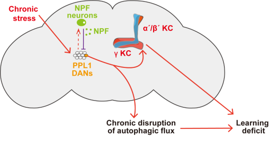 总之,本论文的研究揭示了如图1所示的模型,慢性应激引发过度的多巴胺能活性导致细胞自噬流阻断,而持续的细胞自噬流阻断进而引起学习障碍。另一方面,NPF能系统通过抑制多巴胺能神经活性维持果蝇大脑正常的细胞自噬流,从而促进对CSLD的抗性。这些发现凸显了黑腹果蝇作为疾病模型的潜力,可用于进一步阐明抑郁症相关症状的分子和神经机制,并探索以自噬-溶酶体通路为靶点的治疗潜力。