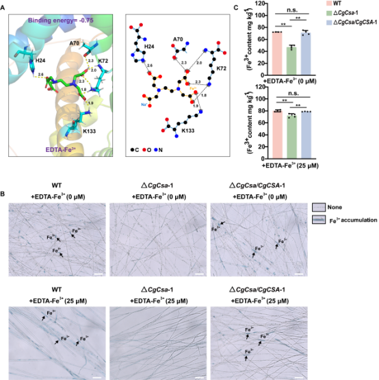 通过基因敲除、回补以及生物学表型分析,发现CgCsa的缺失导致C. gloeosporioides菌丝分生孢子产量降低、细胞壁和细胞膜完整性受到破坏、极性生长受阻、分生孢子萌发延迟和附着胞异常且芽管变长,这些共同导致了CgCsa缺失突变体(ΔCgCsa)致病性下降,而CgCsa 回补体(ΔCgCsa/CgCSA)的生物学表型均与野生型(WT)一致。此外,研究发现与WT和ΔCgCsa/CgCSA相比,ΔCgCsa铁转运相关基因的表达量下调,且在培养基中添加Fe3+可部分恢复ΔCgCsa的生物学功能。进一步通过分子对接,普鲁士蓝染色以及利用电感耦合等离子体发射光谱仪测定菌丝体内铁含量,证明CgCsa蛋白能够与Fe3+结合。综上所述,CgCsa是调控真菌生长发育和致病性的重要蛋白质。其中一个重要机制是 CgCsa具有结合铁的能力,并能维持C. gloeosporioides的铁稳态。这项研究为控制植物真菌病害提供了新的见解,即可通过耗竭真菌所需的微量元素来控制真菌病害,同时为开发CgCsa蛋白作为控制真菌病害的新靶标提供理论依据。